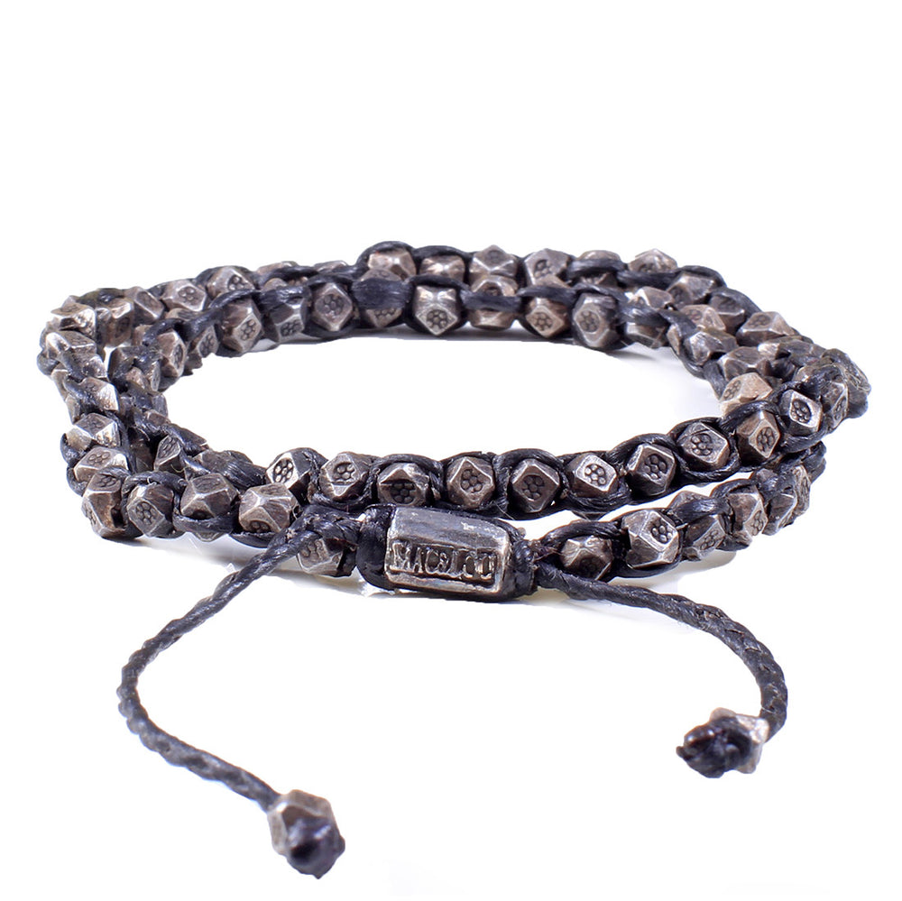 Oxidized Sterling Silver Nuggets are woven with waxed cord into a 2-Layer Wrap Bracelet.