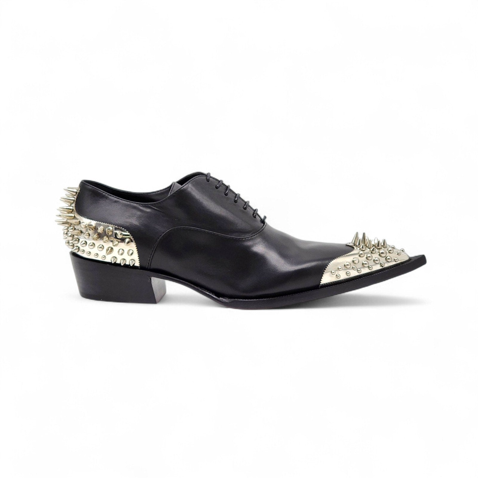 Add edge to elegance with the Christian Louboutin Cheliviss Meteor Flat, a rare limited-edition design meticulously handcrafted in Italy. Made from sleek black leather, these lace-up Oxford-style shoes feature a sharply pointed toe and polished silver-tone spikes adorning the heel and toe cap. The bold silhouette balances refinement with attitude, finished with the iconic red lacquered sole that defines Christian Louboutin’s signature craftsmanship and style.