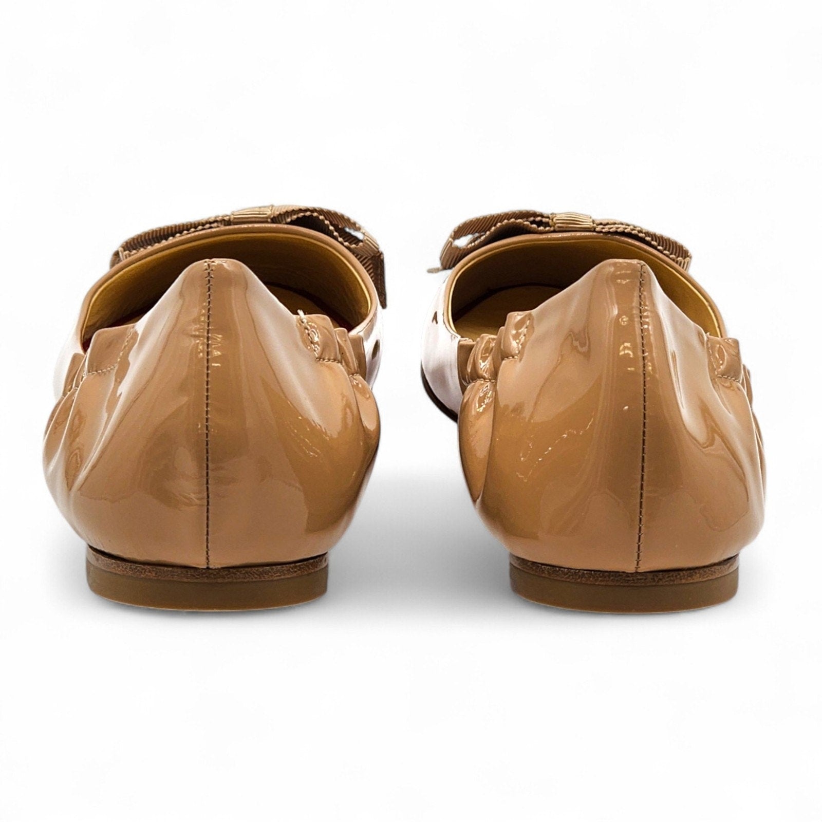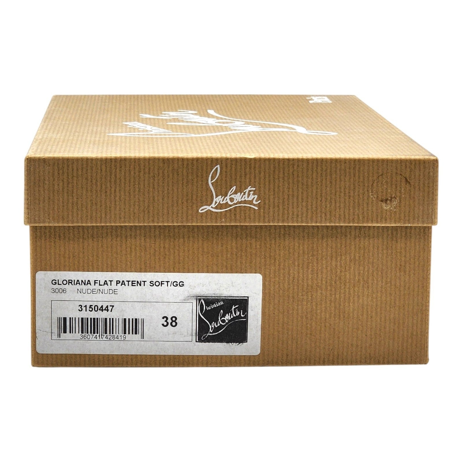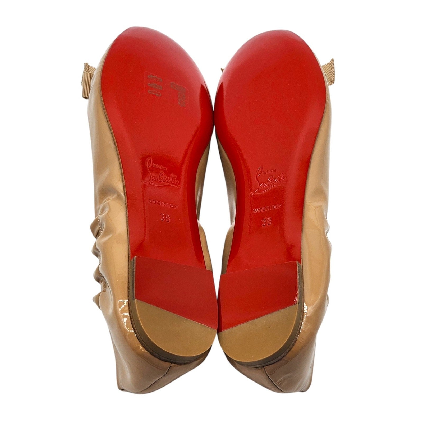 Step into effortless elegance with the Christian Louboutin Gloriana Flat Patent Leather Ballet Flats in timeless nude. Expertly crafted in Italy, these refined flats feature a glossy patent leather upper with a grosgrain bow detail and elasticized sides for superior comfort. Finished with the signature red lacquered sole, they deliver sophistication that transitions seamlessly from day to night.