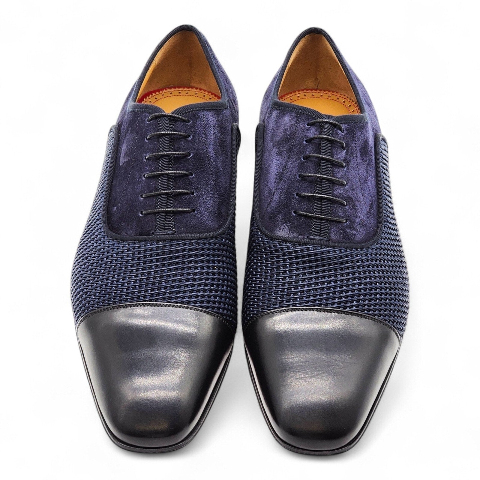 Step into refined sophistication with the Christian Louboutin Greggo Oxford shoes, a masterful balance of texture, craftsmanship, and timeless design. Made in Italy, this striking pair combines supple navy blue suede and elegant mesh panels with sleek black leather cap toes, all set upon Louboutin’s signature red lacquered soles. A statement of understated luxury that transitions effortlessly from formal attire to evening ensembles.