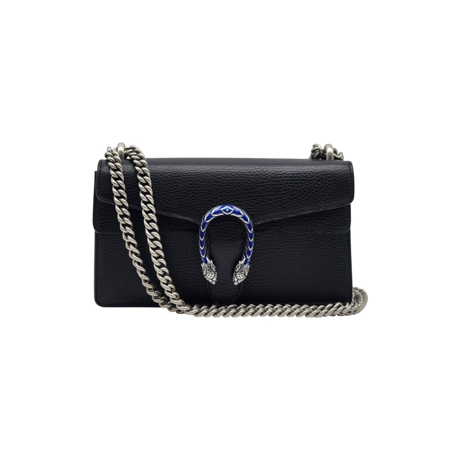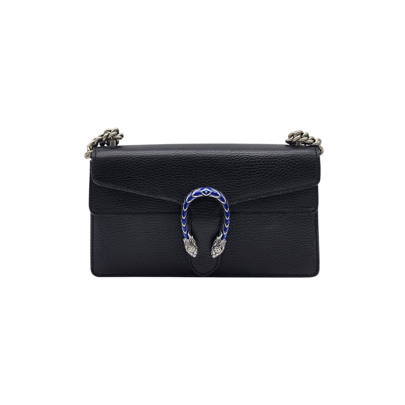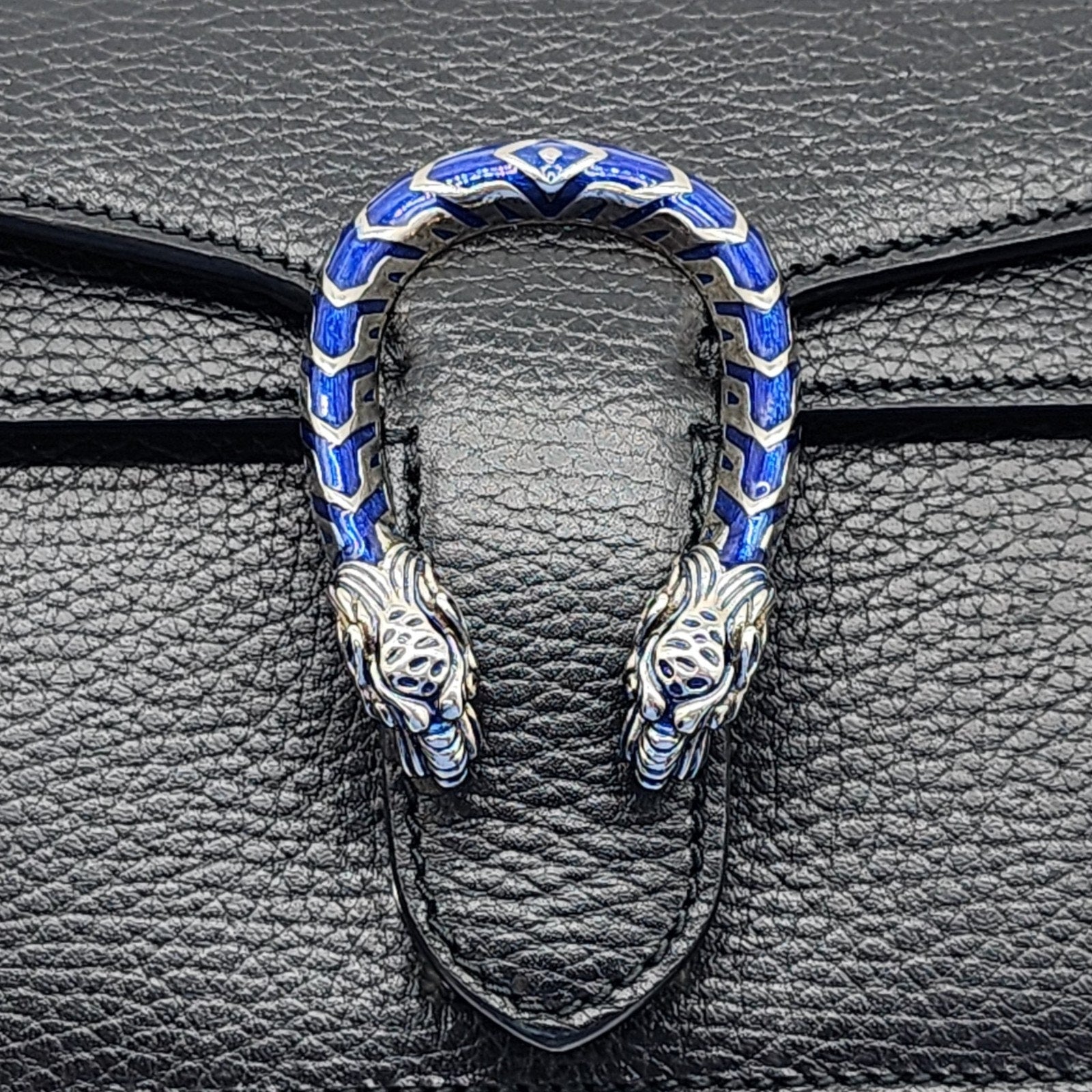This Gucci Dionysus Small Shoulder Bag is crafted from luxurious black pebbled calfskin leather, offering a refined texture with excellent durability. The iconic Dionysus tiger head closure, finished in silver-tone hardware with blue enamel detailing, is inspired by Greek mythology and gives the bag its unmistakable identity. Elegant yet modern, this piece transitions effortlessly from day to evening wear.