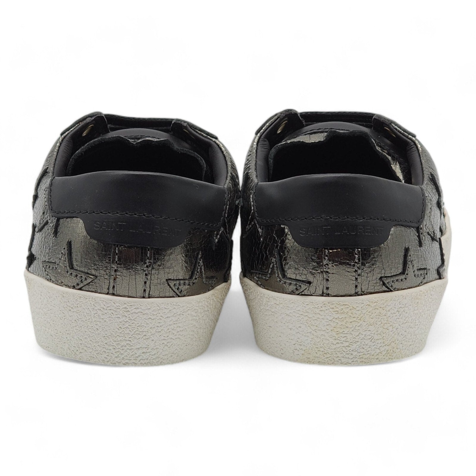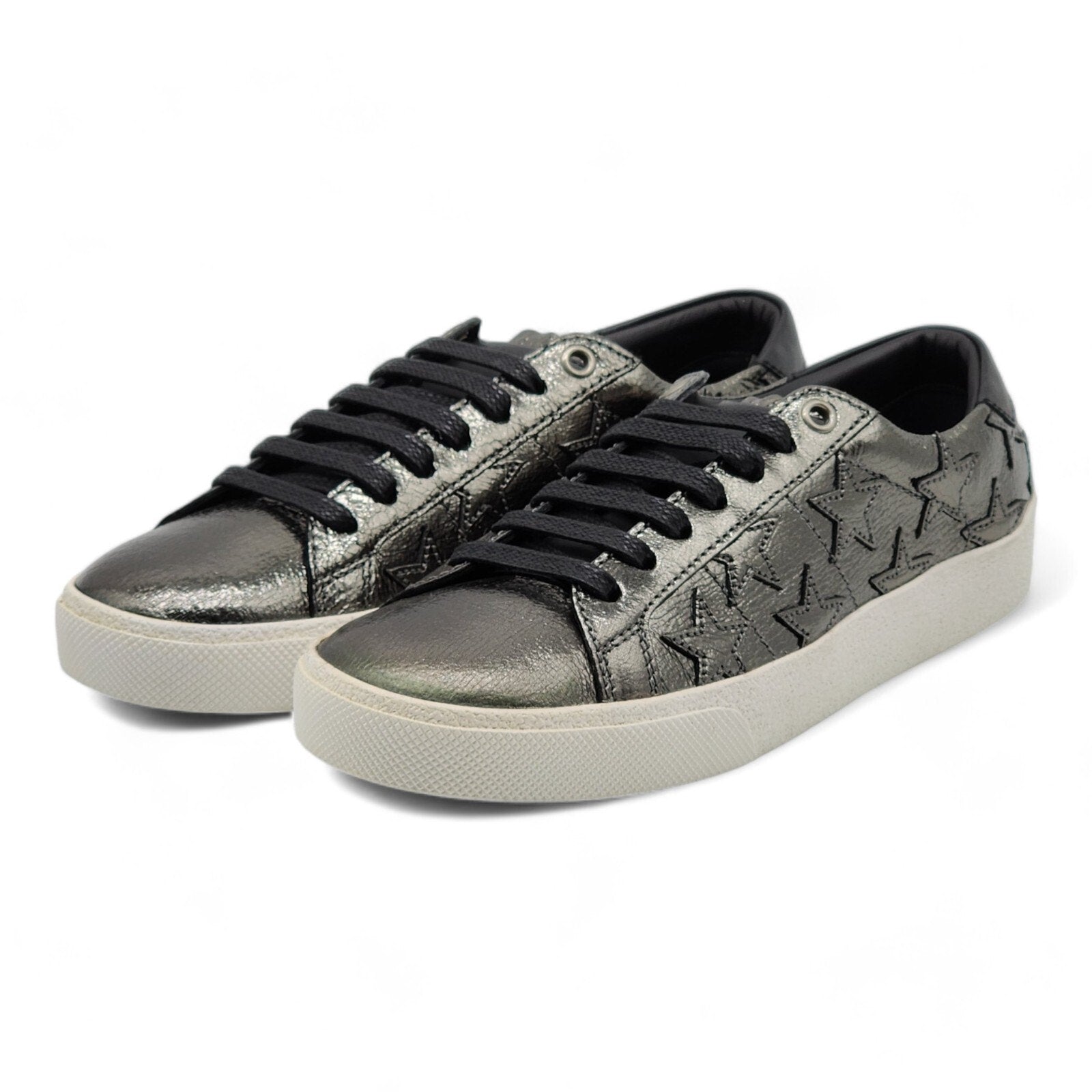 Step into effortless Parisian style with these Saint Laurent Court Stars Leather Sneakers in silver, a chic and modern take on the classic low-top silhouette. Crafted in Italy with Saint Laurent’s renowned attention to detail, the metallic leather upper adds a striking edge, while the star motifs deliver the distinctive look the brand is known for. This pair is offered brand new with the original box, making it an excellent addition for collectors or anyone looking to elevate their casual wardrobe.